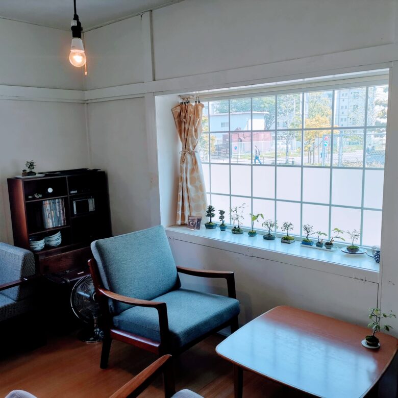 窓際やテーブルに置かれている小さめの盆栽が癒しを深めてくれます。