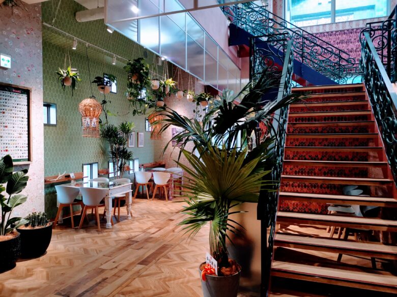 中南米のリゾートをイメージしたガーデニングレトロカフェの名にふさわしい店内。