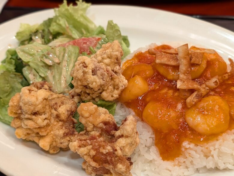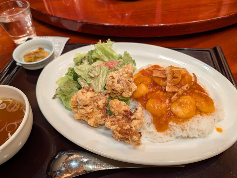 エビチリと唐揚げにサラダ、スープ、ザーサイが付いてるよくばりセット。