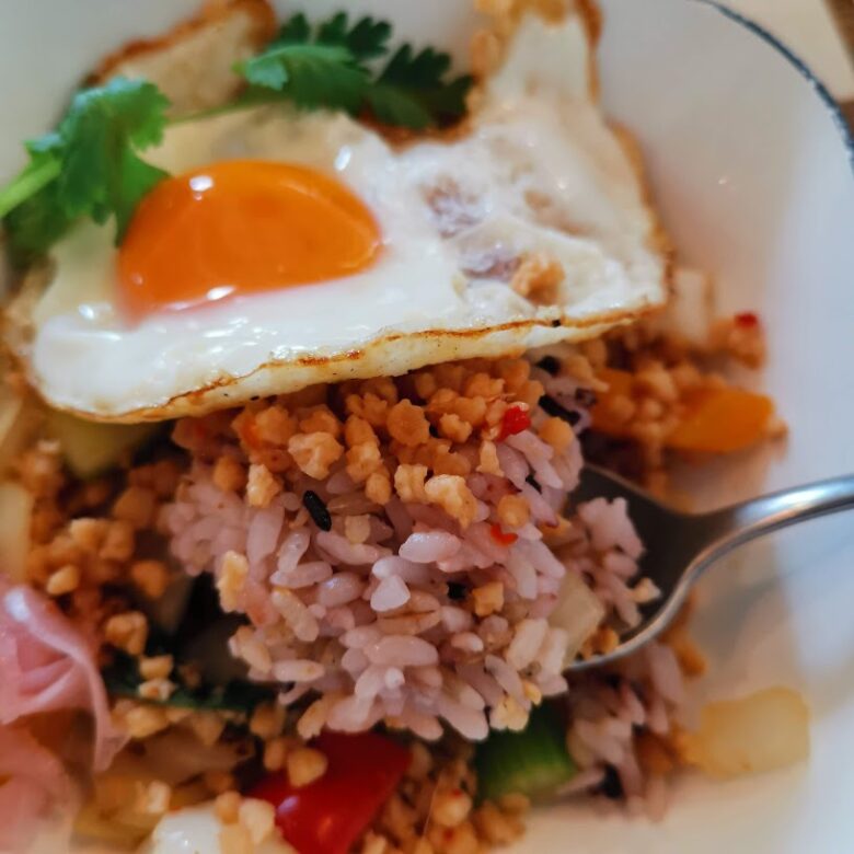 ガパオライスのごはんは雑穀米でヘルシー。