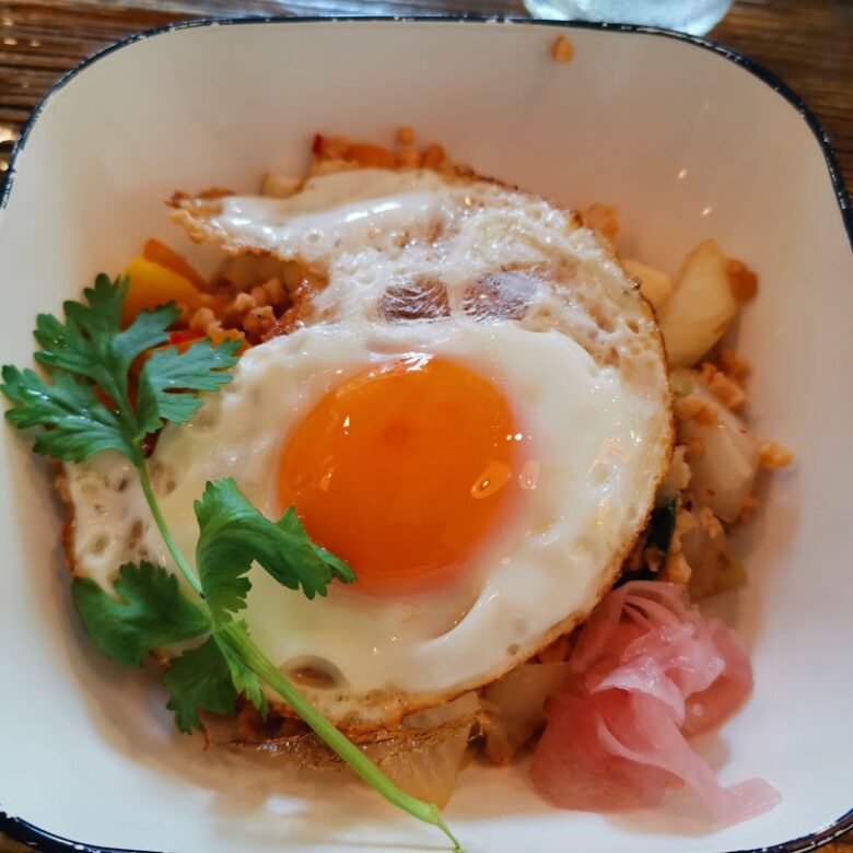 パプリカや玉ねぎの食感がしっかりしていて、トロッと半熟卵を絡めて食べるととてもおいしい!