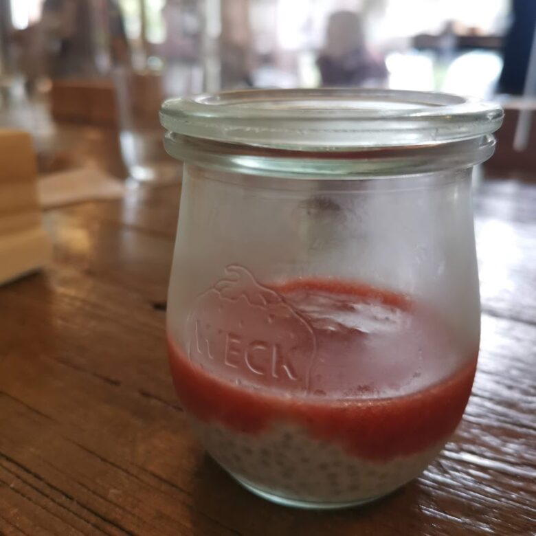 必須脂肪酸やミネラル豊富なチアシードと、オーガニックココナッツミルクと苺のソースのデザートです。
