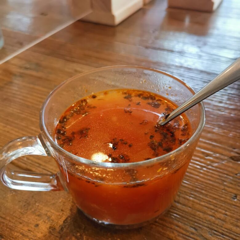 鶏肉が入っていて、香草が食欲をそそるスープで、お野菜の量もたっぷりで満足感があります。